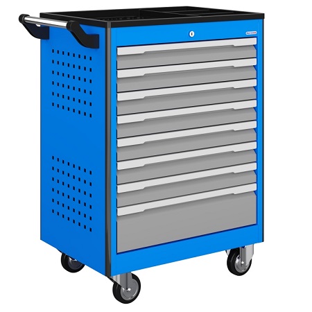 Тележка инструментальная MasterLine комплектуется 7 выдвижными ящиками. Толщина металла 0,8 мм. Цельносварная конструкция корпуса тележки. Центральный замок Euro-Lock. Шариковые направляющие полного выдвижения. Алюминиевая ручка. На боковых стенках тележки выполнена перфорация для установки навесных элементов из нашего каталога.