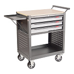Для размещения и хранения подручного инструмента. Оснащена поворотными прорезиненными колесами размером 4" х 1" (2 колеса оборудованы тормозом). 2 стальные боковые ручки. 3 полки (грузоподъемность каждой полки 40 кг).