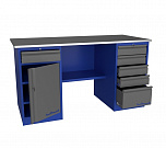 Верстак металлический двухтумбовый, PROFFI-216 Т Д5. Размеры: 870х1600х700мм, 1 тумба - 5 ящиков,1 тумба с дверью (2 полки), замки, полка, оцинк. столешница h=24 мм (фанера+оцинкованный металл 1мм). Нагрузка на столешницу 300кг.