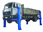 г/п. 10 тонн. Четырехстоечный. Электромеханический. Для ремонта грузовых автомобилей отечественного и импортного производства и автобусов на любой ровной площадке. Привод червячный редуктор, с концевыми выключателями нажимного действия, ограничивающими ход каретки. По отдельному заказу комплектуется установочными рамами. Поставляется в 2 вариантах Стандарт (в помещение) и ТЗ (Для эксплуатации на улице).