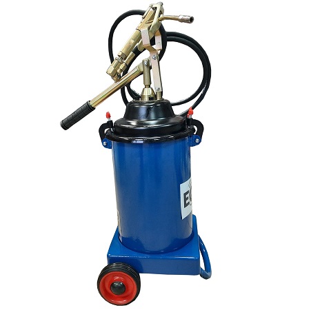 Удобный — в бак входит ведро смазки 20 кг. Экономия денег на смазке до 2-х раз. Экономия времени на заправке шприцов. Для всех пластичных смазок NLGI3. Пневматический. На колесах. Продавливает «ЗАБИТЫЕ» тавотницы. Давление смазки 300-400 Атм. Пистолет с наконечником под тавотницы производительность 850 г/мин. Для шприцевания шарнирных соединений (тавотниц, крестовин, подшипников и т.д.). Заправка смазкой из ведра, тубы, бочки. Высота бака 340 мм. Диаметр бака Ø 280 мм.