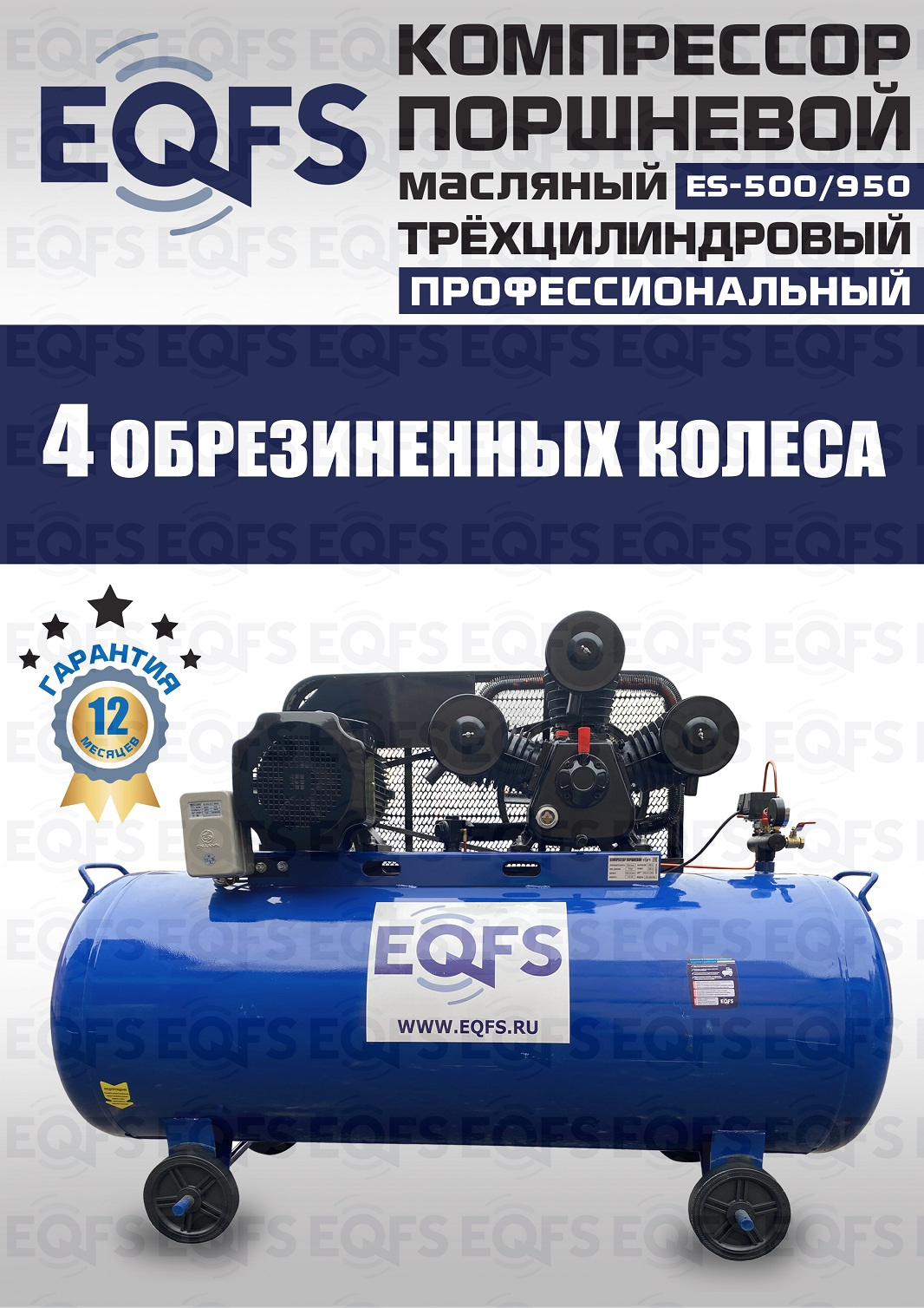 Компрессор воздушный, передвижной, поршневой, масляный, трёхцилиндровый. Быстро достигает нужного давления. Трёхпоршневая головка двигателя уменьшает износ деталей и увеличивает срок службы. Ремённый привод — предохранят мотор от поломки. Идеальное решение для шиномонтажа, автосервиса, строительства, покраски, промышленности. Давление 8 Атм. Производительность 950 л/мин. Мощность 7,45 кВт. Напряжение 380В. Ёмкость ресивера 500 л. Гарантия 12 месяцев.
