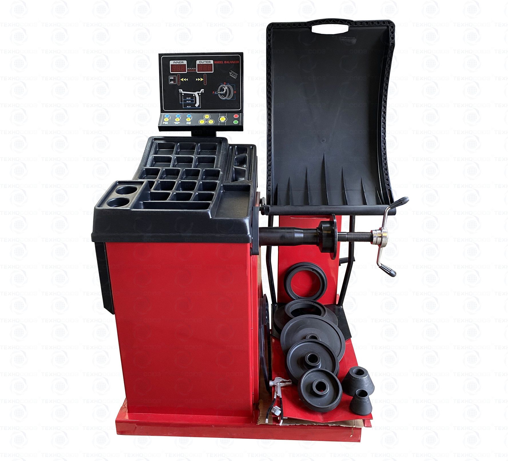 • Балансировочный станок оснащен защитным кожухом для защиты оператора от попадания частиц грязи из протектора покрышки.
