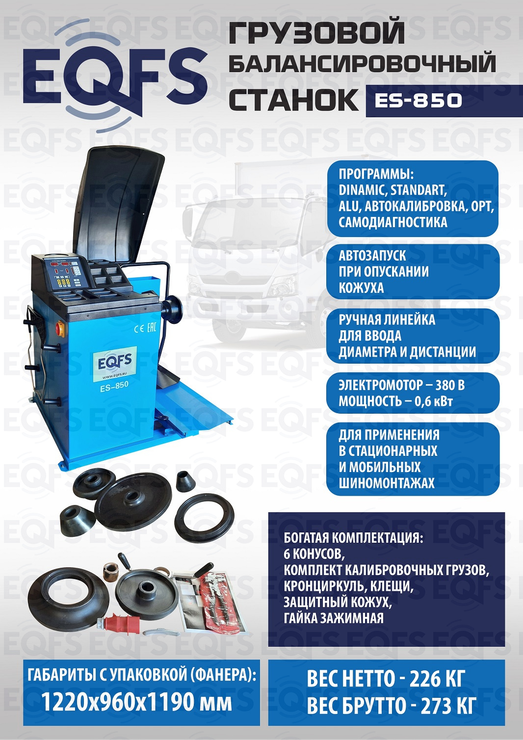 Комплект состоит из ES-26D Шиномонтажного станка c немецким гидронасосом. Очень качественный станок. Отказов и рекламаций нет!!! Диски сталь, AL, с кольцами и без, 14÷26” с адаптерами 14÷42”, Колесо макс. Ø1600 ширина 780мм, до 500кг. Моторы 1,5 + 2,2кВт. Гарантия до 18мес. + ES-850 Балансировочный станок для балансировки колес легковых и грузовых автомобилей. Колесо «в сборе» Ø до 1200 мм, вес до 150 кг. Диски Ø 13-24” ширина 1,5-20”, подключение 380 В. Встроенный пневмоподъемник. Гарантия до 18 мес.