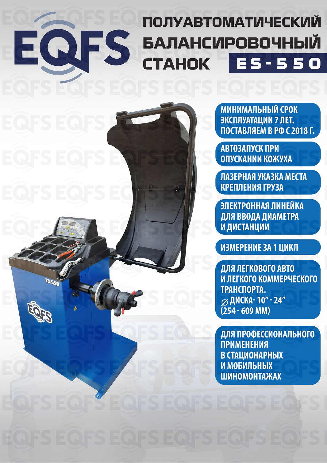 ES-550 Балансировочный стенд. Полуавтомат. Удобный и понятный интерфейс. Автозапуск опусканием кожуха. Автоматический ввод дистанции и диаметра диска. Лазерная навигация. Автокалибровка. Для колес легковых автомобилей, мотоциклов, «Газелей», «Спринтеров» с диаметром диска с резиной до 800 мм. Размеры диска: ширина 3–10” (76-254 мм) , диаметр диска 10–24” (254÷609 мм). Вес ≤ 65 кг. Вал- 36 мм. Точность ±1гр. 220 В. Режимы работы DINAMIC, STATIC, ALU1, ALU2, ALU3, ALUS, ST. Гарантия 12 мес.