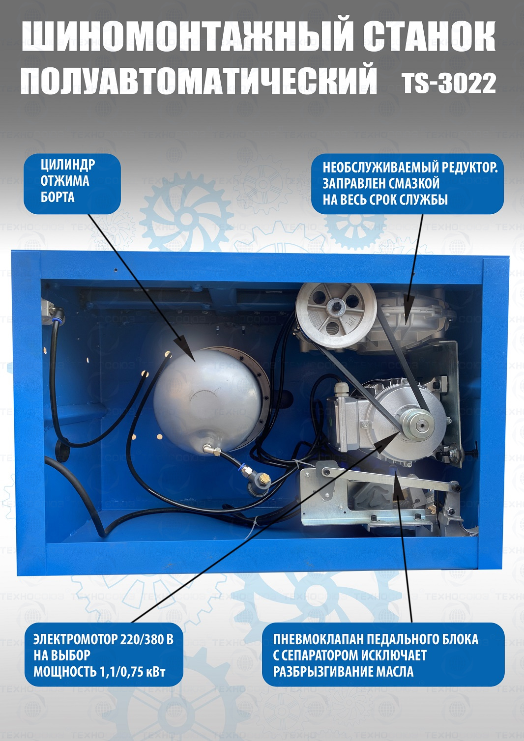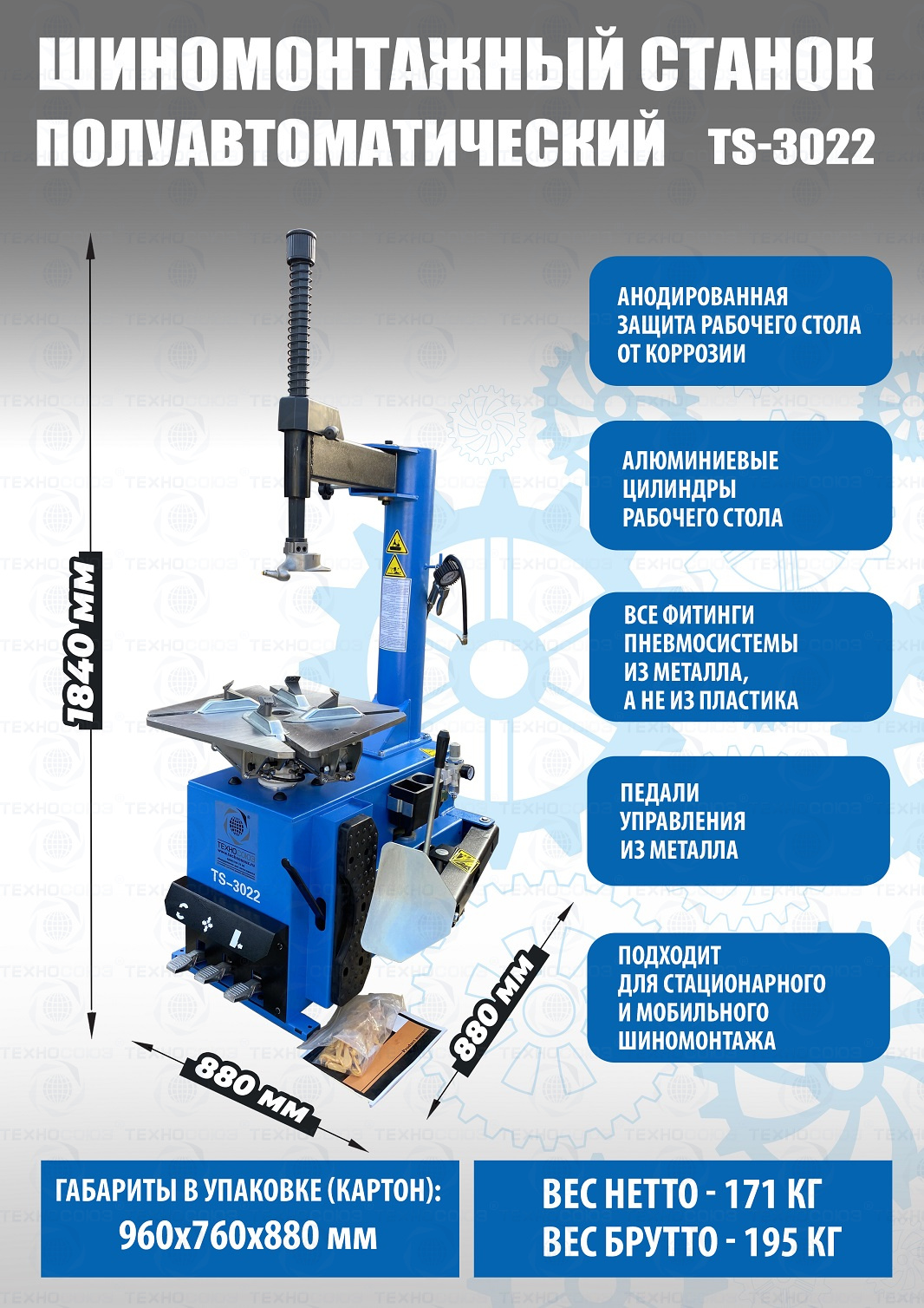 Шиномонтажного полуавтоматического станка TS-3022 предназначен для монтажа и демонтажа колес легковых автомобилей, легких грузовиков, не больших автобусов и коммерческой техники. Внешний зажим 11-21”. Внутренний зажим 12-24”.В комплекте: пистолет для подкачки шин + монтажка + регулятор давления с влагоотделителем и манометром. Рекомендуется для постов со средней и высокой проходимостью