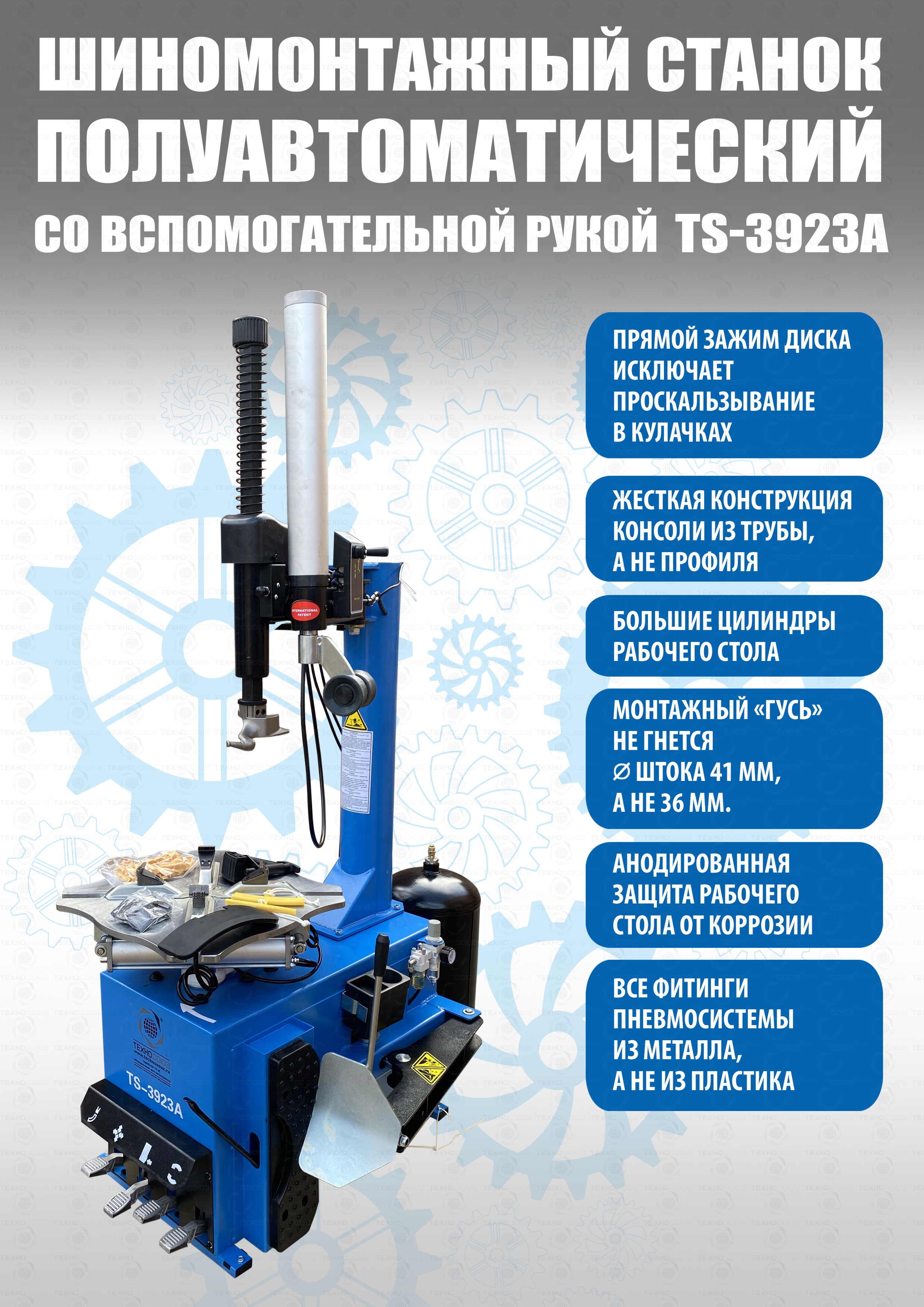 шиномонтажного полуавтоматического станка TS-3923A Для больших и широких колес. Комплектуется встроенным увеличенным бустером емкостью 24 литра (взрывная подкачка) + дополнительной вспомогательной рукой для работы с низкопрофильными шинами и RanFlat! Для монтажа и демонтажа колес легковых автомобилей, легких грузовиков, не больших автобусов и коммерческой техники со средней и высокой проходимостью. Внешний зажим 12-22”. Внутренний зажим 13-24” Напряжение 220В/380В. В комплекте: пистолет для подкачки шин + монтажка + регулятор давления с влагоотделителем и манометром. Напряжение 220В/380В