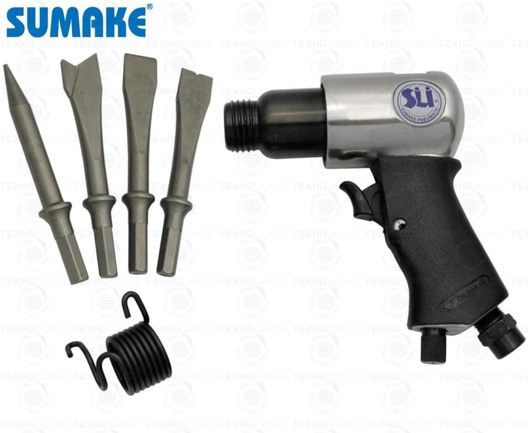 Пневмомолоток + 4 зубила предназначены для проведения как отбойных, так и зачистных работ. Частота ударов 4500/мин. Длина хода поршня 41 мм. Хвостовик зубила (шестигранник) 10,1 мм.