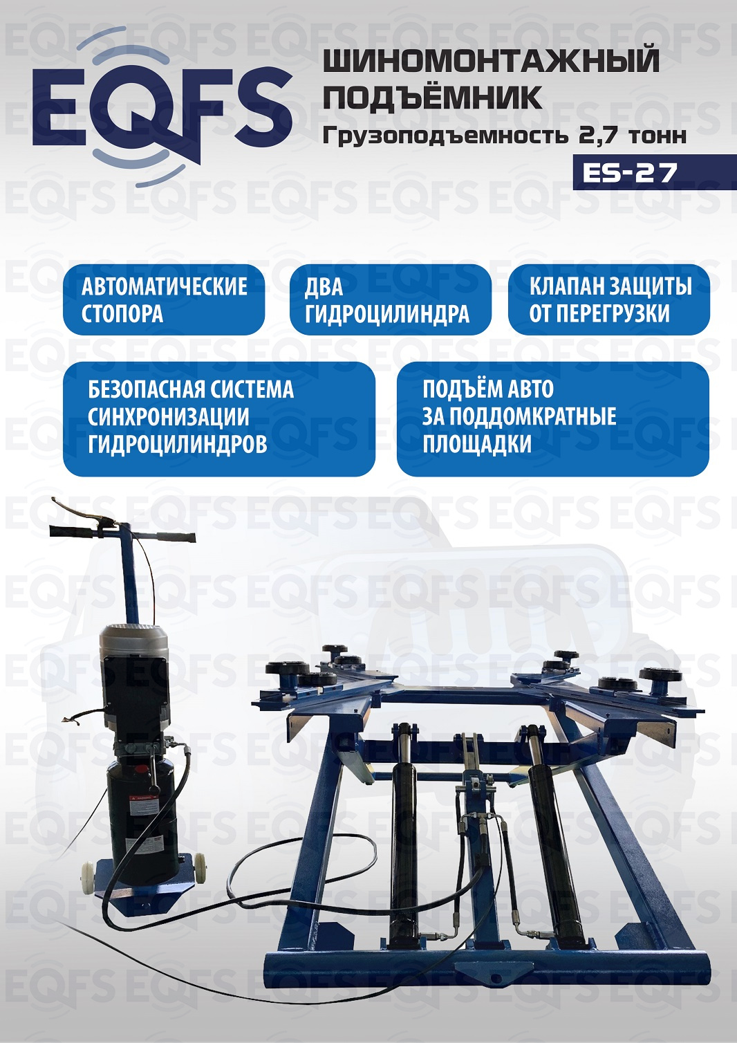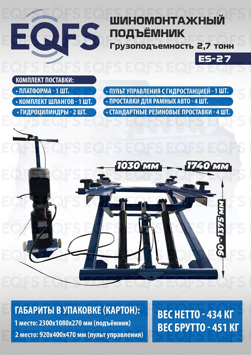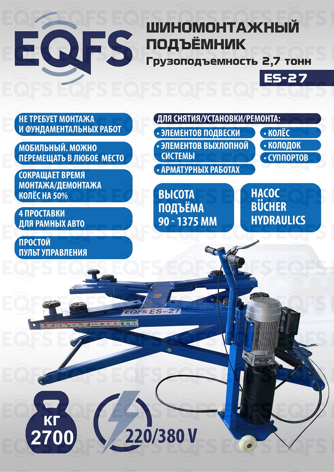 Шиномонтажный подкатной (передвижной) гидравлический подъёмник г/п 2,7т. Также подходит для замены колодок, чистки/смазки суппортов, работ с элементами подвески, для малярно-арматурных работ. Подхват (зависит от проставок) 90/150/195/265мм. Постановка на стопора автоматическая. Высота подъёма (зависит от проставок) 1200/1260/1305/1375мм. Длина платформ 1685 мм. Ширина платформы 1030 мм. Для легковых авто, внедорожников. Макс. ширина рамы авто 1880мм. Насос «Bucher hydraulics» 2,2кВт.