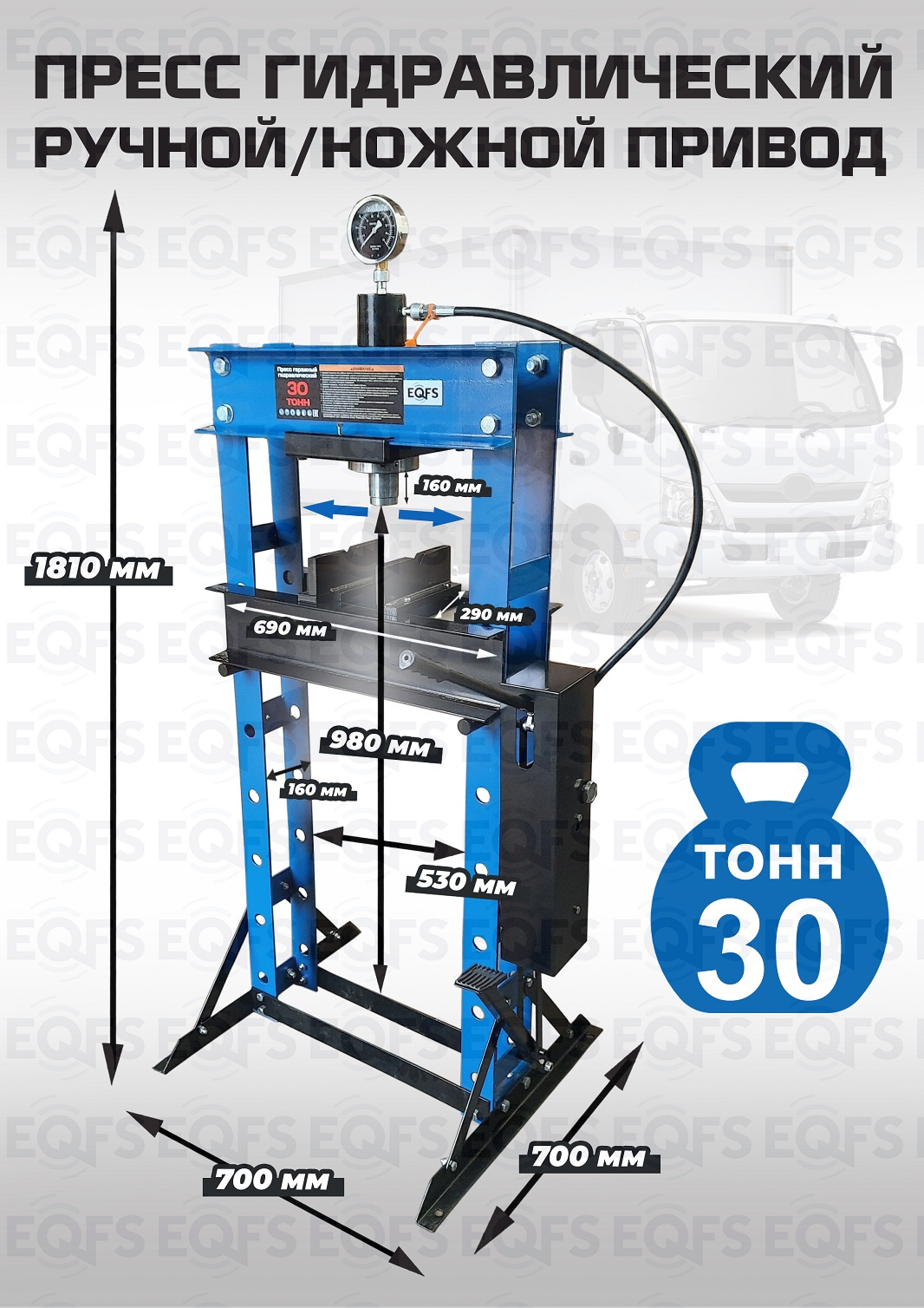 Пресс гидравлический. «Свободные руки» — ножной / ручной. Усилие 30 тонн. Поршень приводится в действие нажатием на ручку или педаль. Рекомендуется для выпрессовки деталей машин, втулок и т.п. в автосервисе, гараже и СТО. Гидроцилиндр с пуансоном имеет возможность перемещения по всей ширине каретки. Цвет синий. Подъёмная площадка регулируется по высоте и фиксируется в требуемом положении. Пуансон 0-160 мм. Рабочее окно 530х980 мм. Доставка по РФ и ТС.