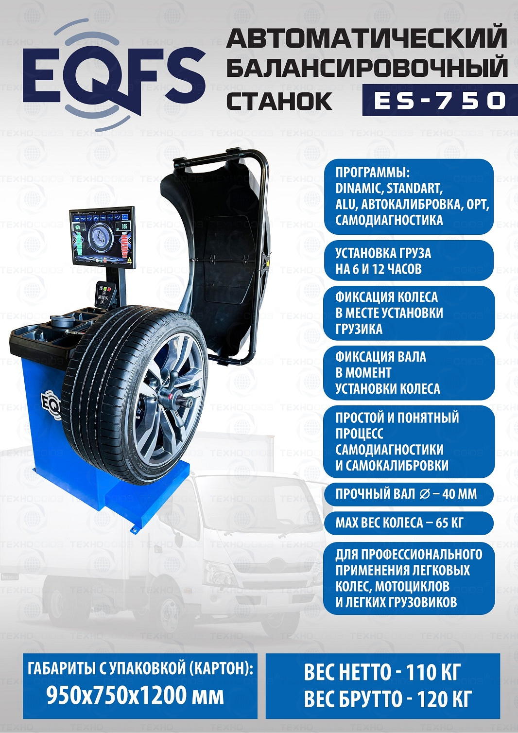 ES-750 Автоматический балансировочный станок. Автодоводчик и лазерная указка места установки грузика. Автоматический ввод 3-х параметров. Для колёс шириной 315мм, Ø до 800мм и весом до 65кг. Диски ширина 3–10” (76-254 мм) , диаметр 10–24” (254÷609 мм) Программы: статическая и динамическая балансировка, ALU, OPT, SPLIT, калибровка и самодиагностика. LCD монитор 19 дюймов. Вал Ø - 40мм. Для балансировки колёс легковых автомобилей, мотоциклов, лёгких грузовиков и широких колёс. Гарантия 18 мес – наш монтаж, 12 мес – самостоятельная установка.