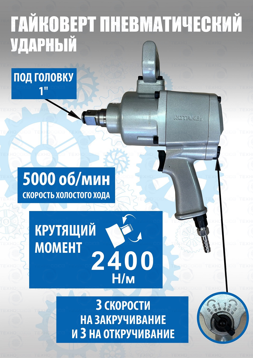 Гайковерт грузовой пневматический. Реверсивный. Ударный. Для слесарных работ с грузовыми автомобилями, автобусами, троллейбусами и спецтехникой. Рекомендуемое применение – слесарные мастерские, автотранспортные предприятия, производственные предприятия, стройплощадки. Максимальное усилие - 2400 Нм. Посадочный размер под головку - квадрат 1”. Максимальный размер резьбы – М38. Вес – 10 кг.