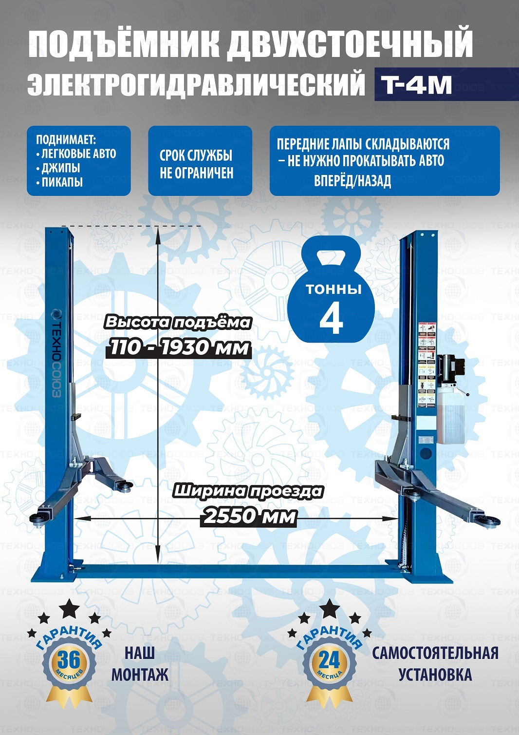Гарантия 36 мес – наш монтаж, 24 мес – самостоятельная установка. Срок службы – не ограничен. Поднимает ВСЁ – от «Оки» до «LC200». Съем со стопоров – ручной. Тросом на каждой колонне. Передние лапы изогнутые (715-1041 мм) складываются по ходу движения авто, задние лапы (905-1451 мм)  - не нужно прокатывать вперёд/назад. Мотор 2,2кВт. 220/380В. Высота подъёма 110÷1930 мм. г/п - 4 тонны.