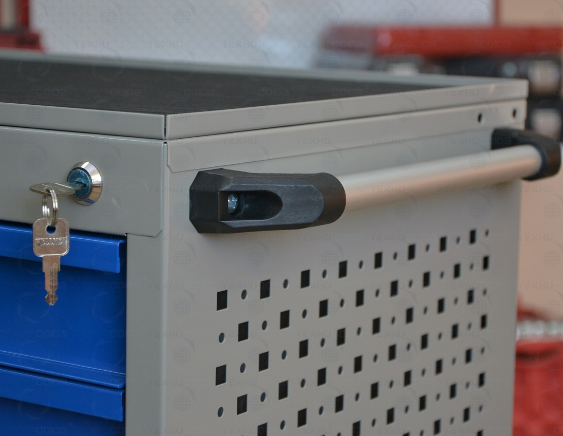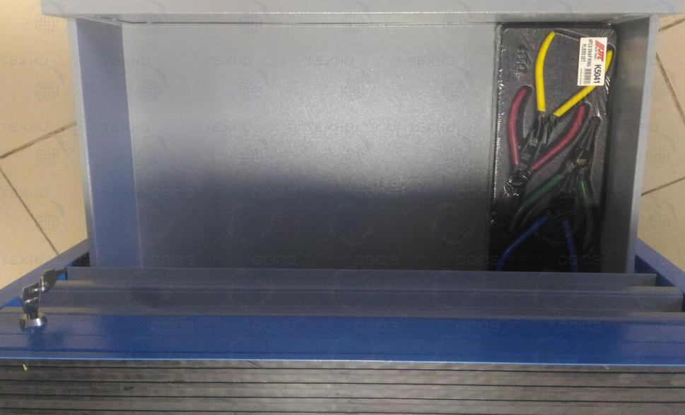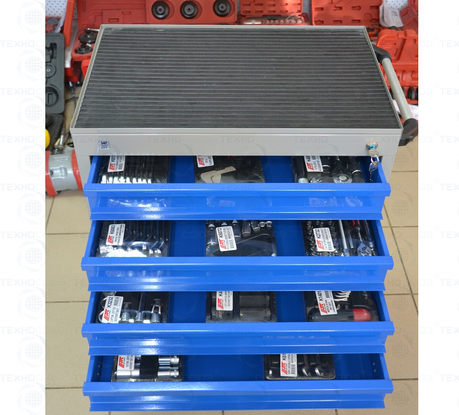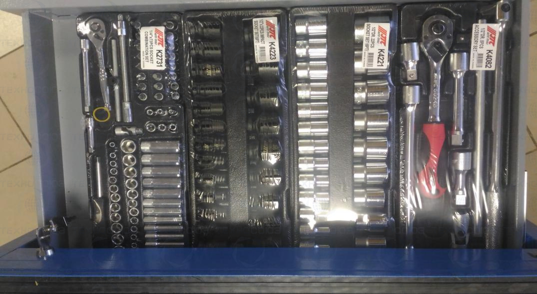 Данный набор инструмента включает: тележку инструментальную с 4 ящиками, комбинированные ключи, наборы головок и отверток, клещи, утконосы, щипцы и трещотку - это тот самый минимум, который понадобится при работе в гараже или СТО.