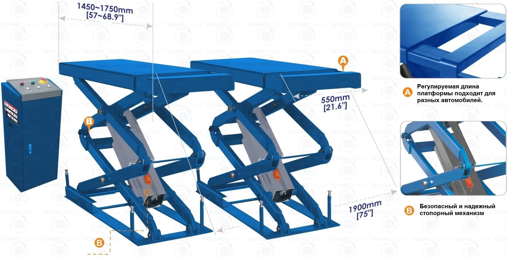 - Заездные трапы подъемника позволяют увеличить длину платформ с 1540 до 1740 мм.