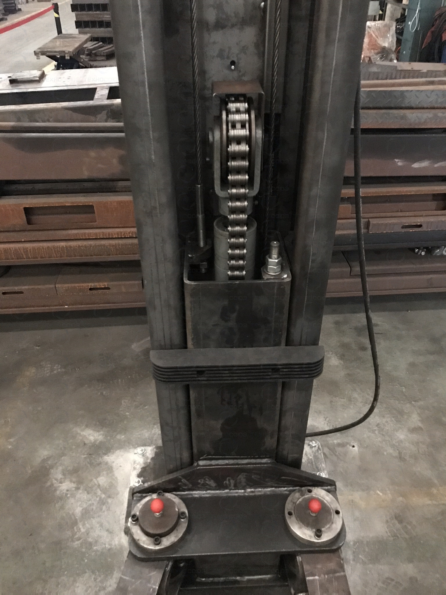 Два гидроцилиндра, распределяют нагрузку равномерно на 2 подъёмные цепи.
