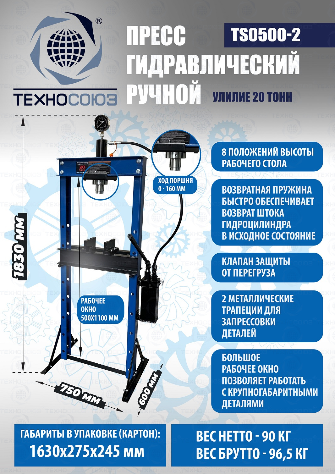Конструктивные особенности TS0500-2 пресс гидравлический ручной 20 тонн: