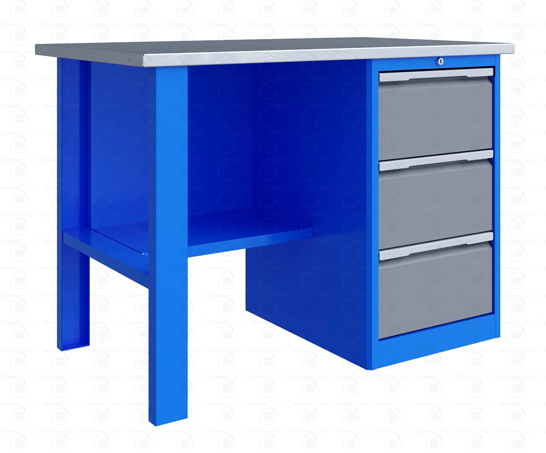 Однотумбовый. Допустимая нагрузка на столешницу 750 кг. Опорные элементы выполнены сварными из холоднокатаной стали. Верстак комплектуется полкой-стенкой, расположенной под столешницей для удобного размещения габаритного инструмента и оснастки. Все металлические элементы покрыты полиэфирной порошковой краской, обеспечивающей хорошую износостойкость покрытия и невосприимчивость его к моющим средствам и смазочным веществам. Столешница состоит из листа влагостойкой фанеры марки ФСФ толщиной 24 мм, которая покрыта лаком-антисептиком и листом оцинкованной холоднокатаной стали толщиной 1,2 мм. Глубина столешниц 696 мм. Размеры (ВхШхГ) 855x1196x696 мм.