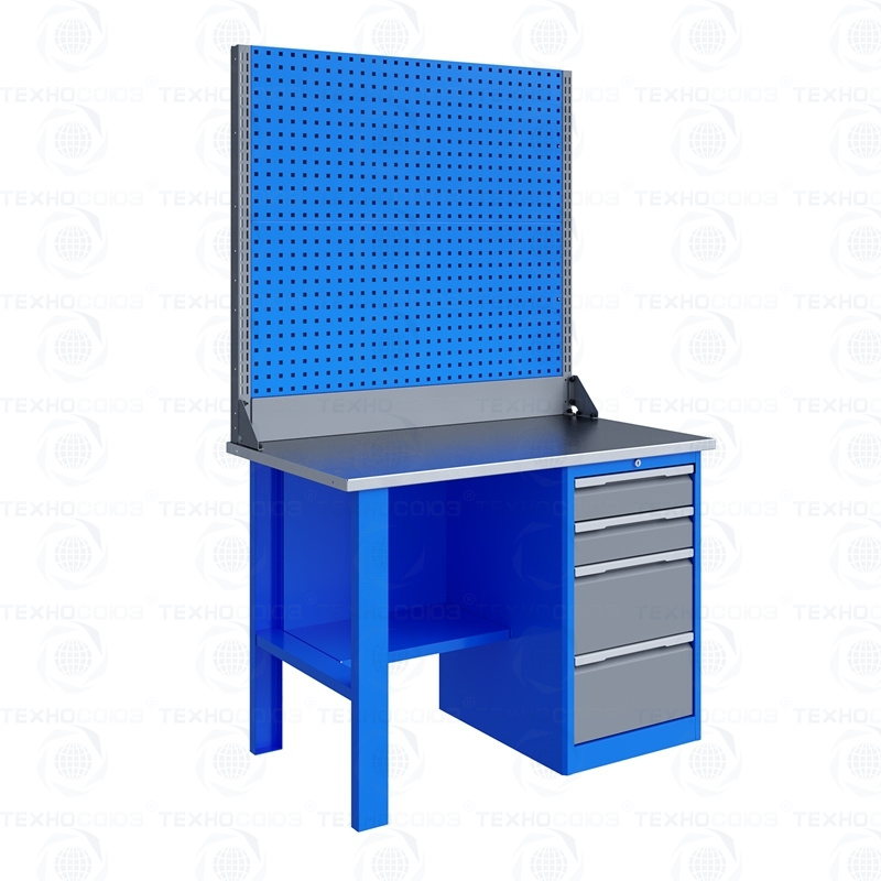 Однотумбовый. Допустимая нагрузка на столешницу 750 кг. Опорные элементы выполнены сварными из холоднокатаной стали. Для выполнения сборочных, ремонтных, слесарных, монтажных и других видов работ на производстве, в сервисных центрах, мастерских, гаражах, а также для обучения технологии в учебных заведениях. Комплектуется полкой-стенкой, расположенной под столешницей для удобного размещения габаритного инструмента и оснастки. Размеры верстака: 855x1196x696 мм. Вес: 73 кг. Поставляется в 4 комплектациях на выбор.